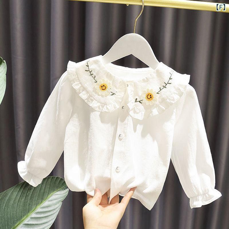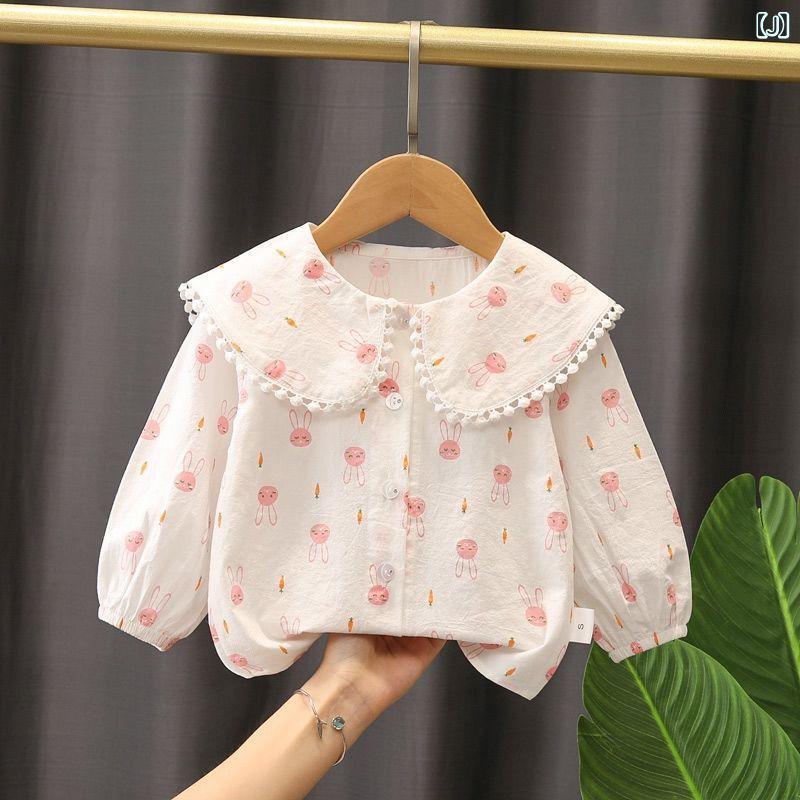 シャツ キッズ 女の子 長袖 コットン 春秋 かわいい 80 90 100 110 120 杏色 葉っぱ 小花柄 赤ボタン 五角星 レインボーカラー 3つ さくらんぼ 四角襟 グリーン
