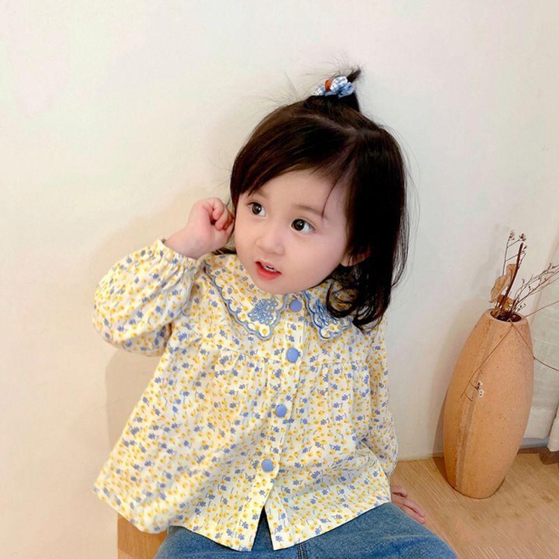 シャツ ベビー 女の子 長袖 春秋 幼児 小花柄 パフスリーブ 丸襟 コットン 80 90 100 110