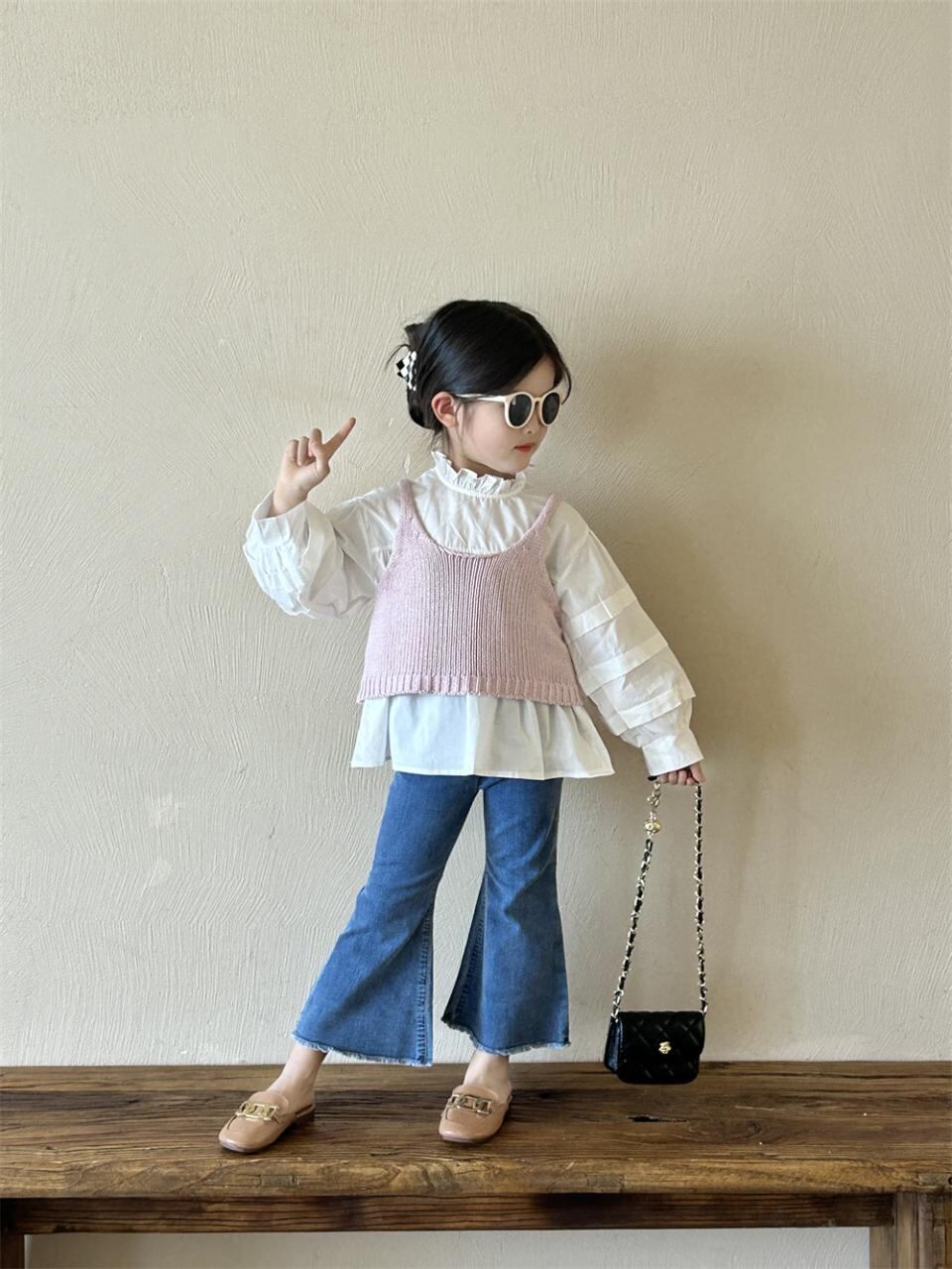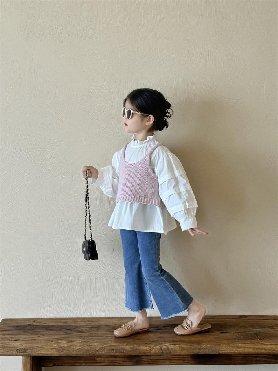 シャツ 子供服 女の子 長袖 ブラウス デニム パンツ セットアップ ニット トップス 春秋 立襟 ギャザー パフスリーブ 9分丈 伸縮性