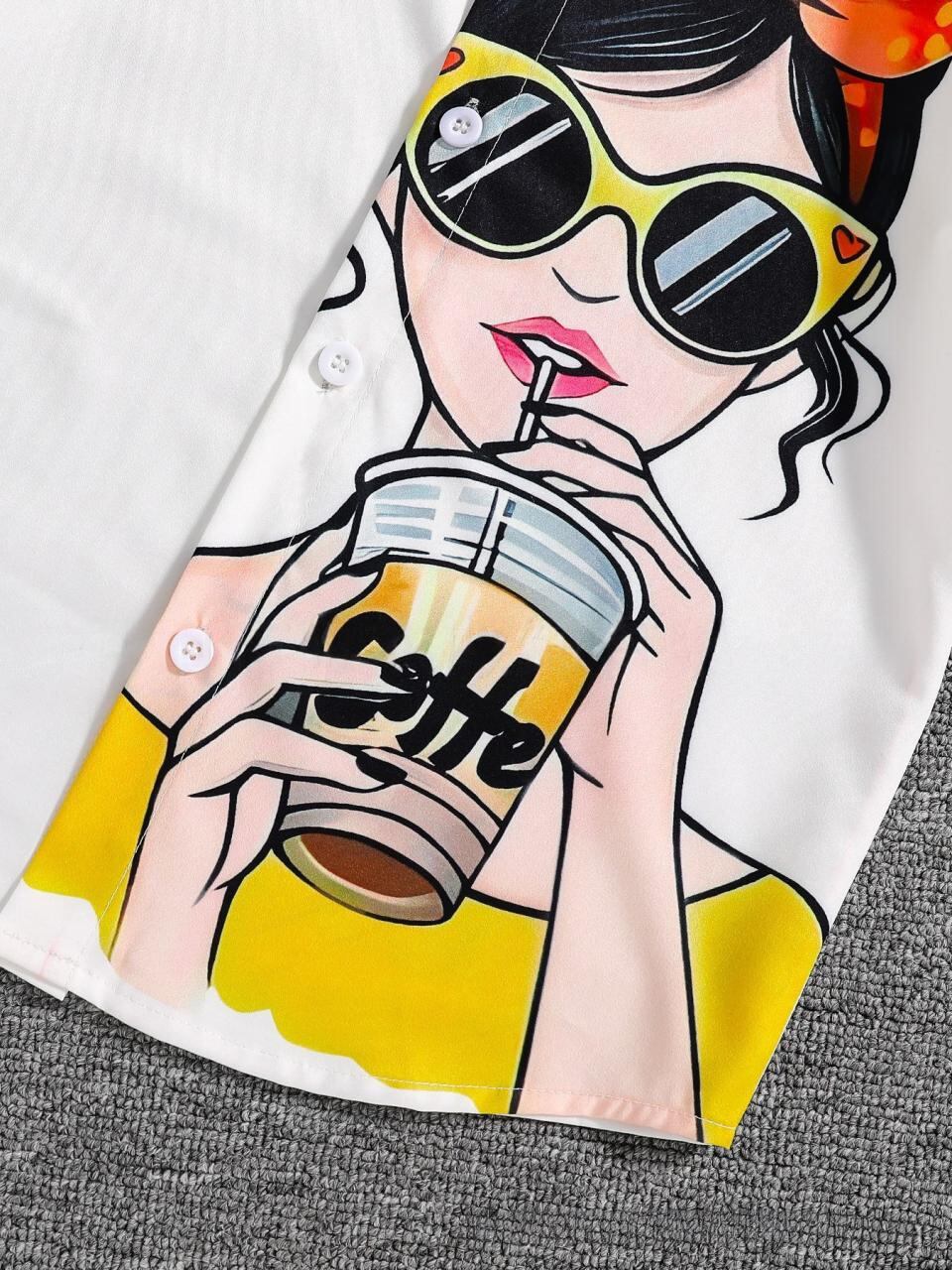 シャツ ガールズ 子供服 半袖 薄手 翻襟 かわいい カートゥーン プリント トップス リラックスフィット 女の子 普段使い ポリエステル ホワイト 春夏