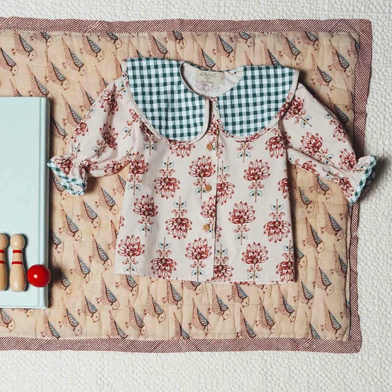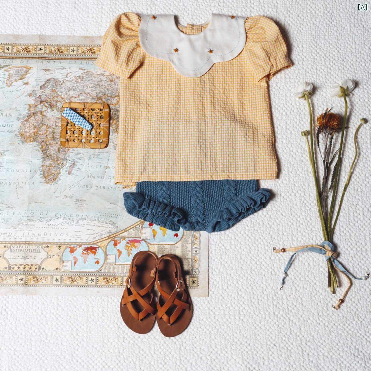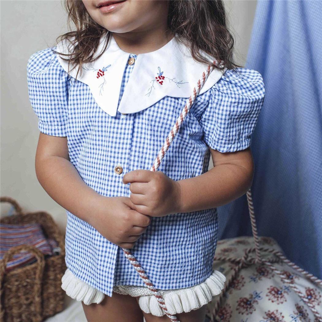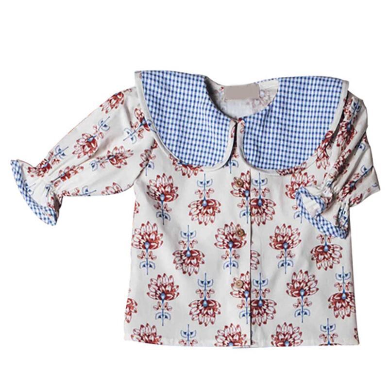 子供服 シャツ 女の子 半袖 泡袖 フラワープリント 襟付き チェック柄 トップス チュニック スペイン風 ヨーロピアン かわいい ガーリー 春夏 人工彩綿
