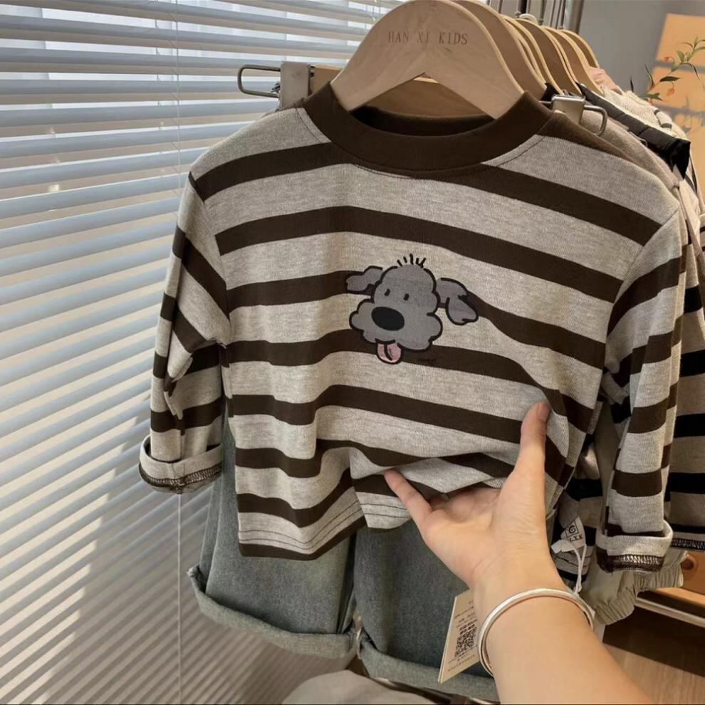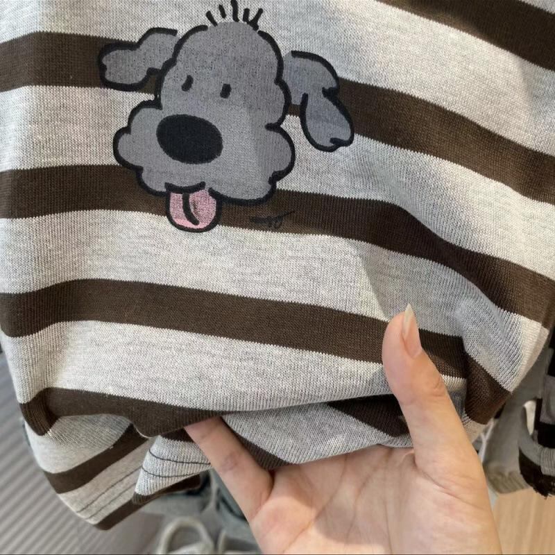 子供服 Tシャツ 長袖 春秋 男女兼用 ストライプ カートゥーン 犬 プリント 綿95% ゆったり トップス カットソー 通園 普段使い
