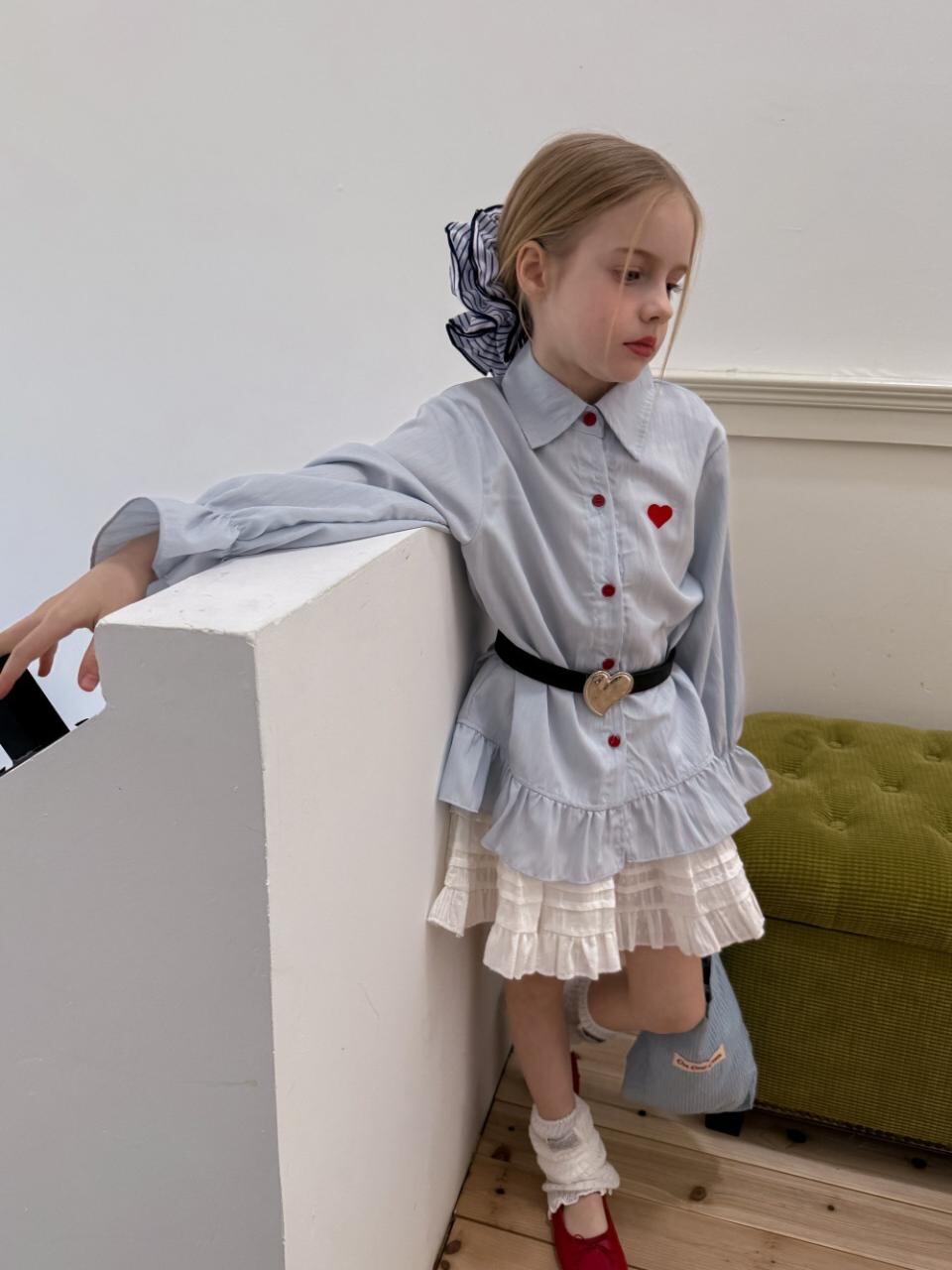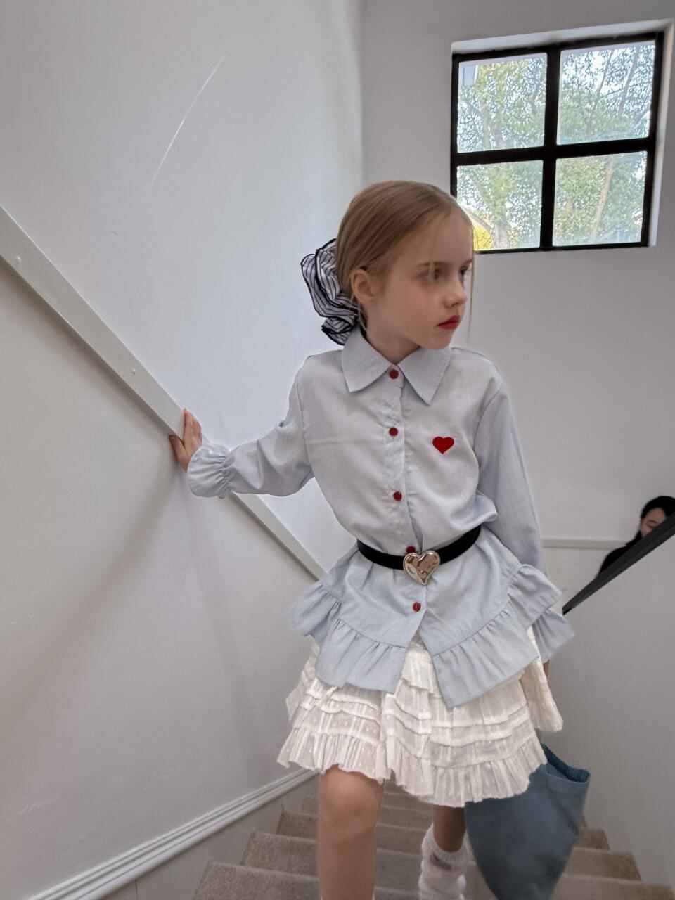 子供服 シャツワンピース 女の子 長袖 刺繡 ハート柄 春秋 プリンセス フリル 襟付き コットン 柔らかい 8歳以上 水色 ウエストベルト付き