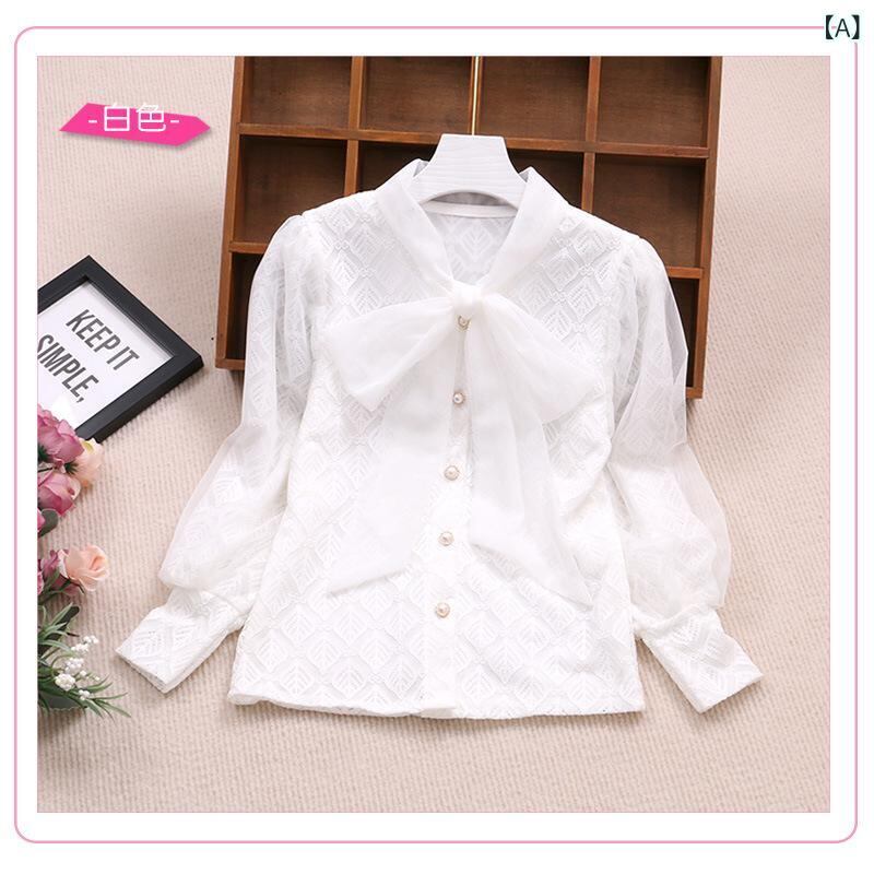 シャツ キッズ 春秋 長袖 チュール レース フリル リボン かわいい 女の子 子供服 トップス 普段使い フォーマル 発表会 お出かけ 100 110 120 130 140 150 160 170 ホワイト 白 杏色 ピンク(x2)