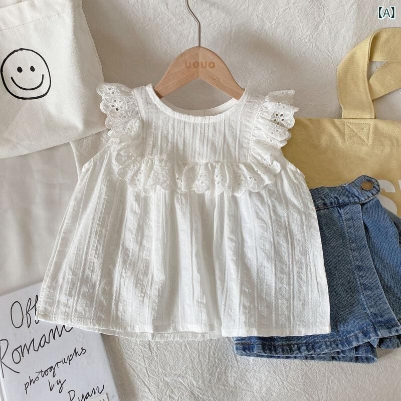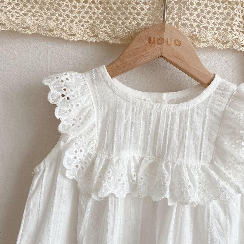 シャツ ガールズ キッズ ノースリーブ 花柄 レース コットン ブラウス ラウンドネック 子供服 女の子 夏服 かわいい おしゃれ 90 100 110 120 130 ホワイト
