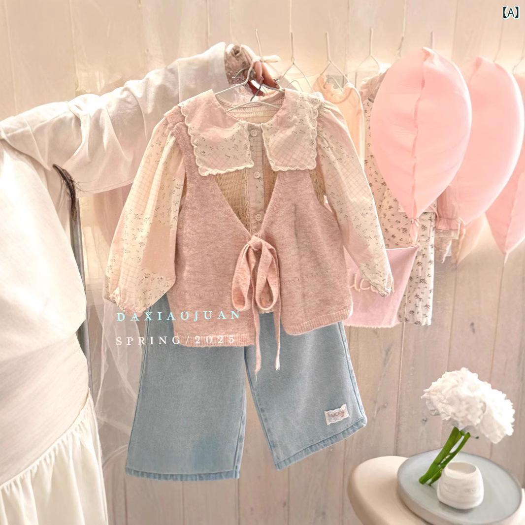 シャツ 子供服 春物 女の子 小花柄 ブラウス ニット ベスト 2点セット 長袖 A類安全 綿100% かわいい フリル 襟付き ストライプ 切り替え 普段着 お出かけ着