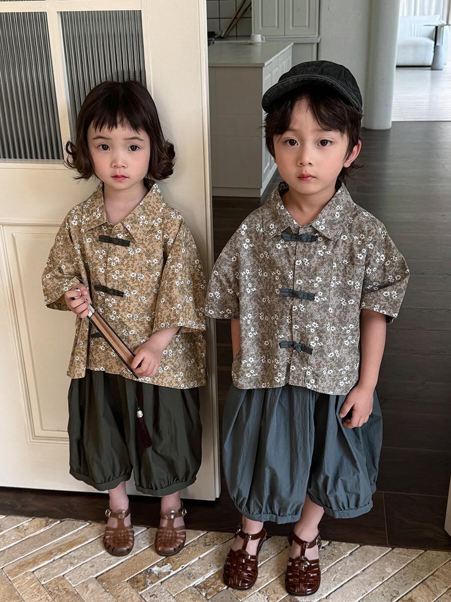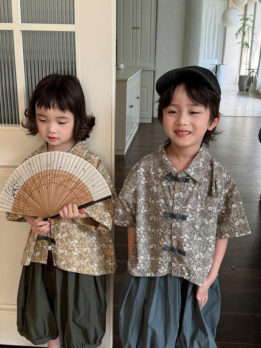 シャツ キッズ 男の子 半袖 花柄 チャイナ風 コットン ゆったり 普段着 グレー カーキ 80cm 90cm 100cm 110cm 120cm 130cm 140cm
