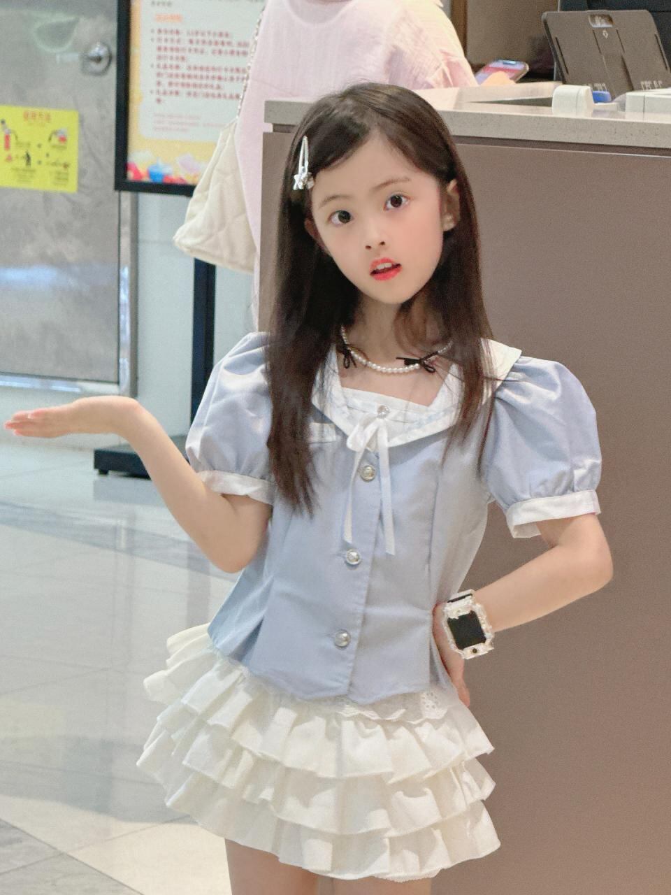 シャツ ガールズ 半袖 ブラウス スウィート アメリカン カジュアル 制服風 学院風 夏 翻領 トップス 140cm以上 親子コーデ 綿混紡 ブルー系 ホワイト