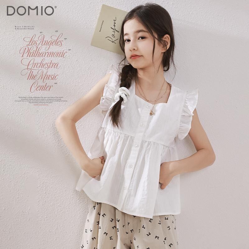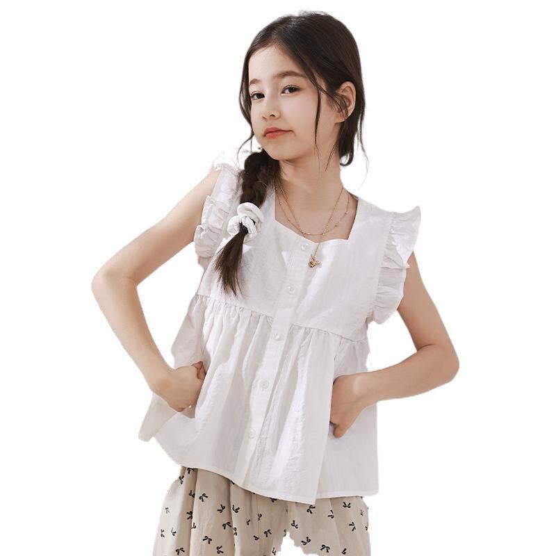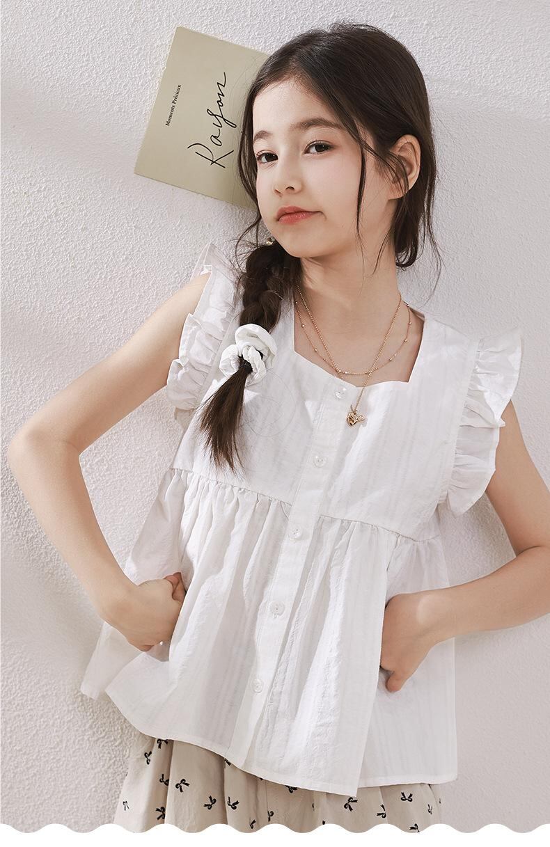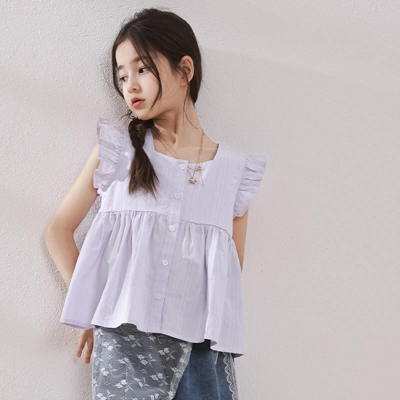 シャツ キッズ 女の子 ノースリーブ ブラウス 子供服 トップス 親子コーデ 100%コットン フリル 無地 夏 ホワイト パープル