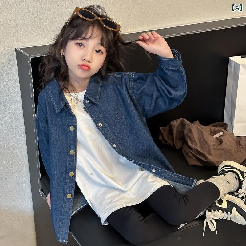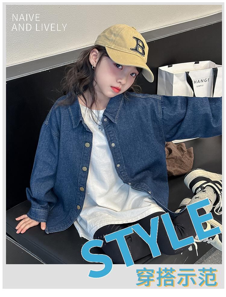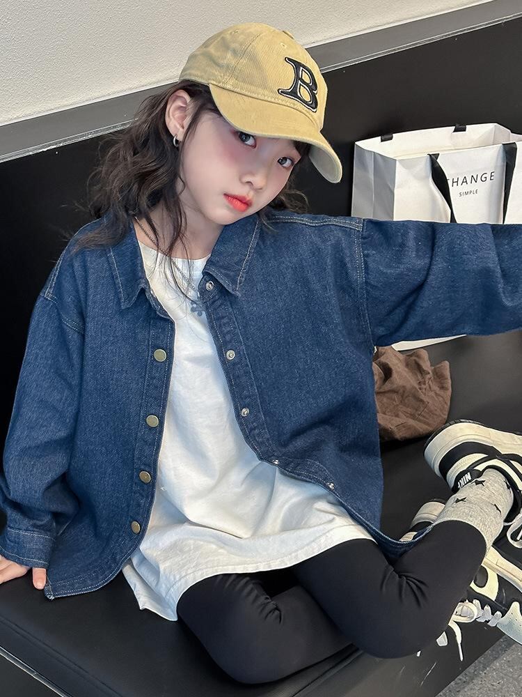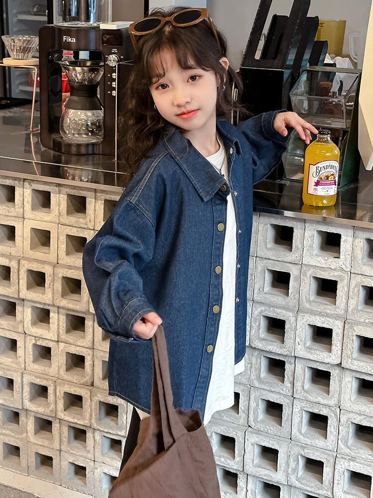 子供服 シャツ ガールズ デニムシャツ 長袖 春秋 ゆったり 120cm 130cm 140cm 150cm 160cm 170cm 翻襟 無地 ブルー