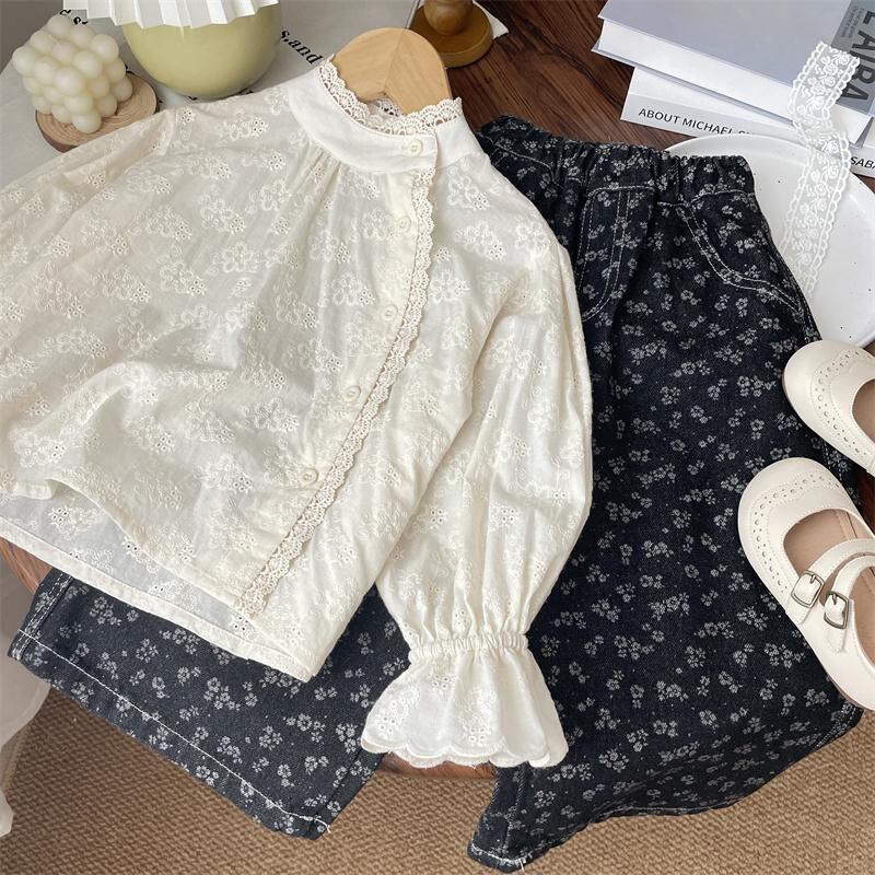 シャツ 女の子 子供 長袖 立襟 斜め開き レース コットンブレンド 森ガール 深色 花柄 デニムパンツ セットアップ かわいい ガールズ トップス ブラウス 普段着