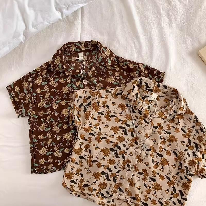 子供服 シャツ 半袖 ベビー キッズ 兄弟 姉妹 花柄 レトロ 薄手 ポロシャツ ポリエステル リゾート 普段使い ブラウン ベージュ系