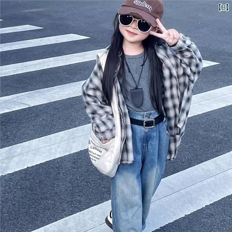 子供服 女の子 格子柄 シャツ デニムパンツ セットアップ 春秋 長袖 コットン 幼児 ベビー ガールズ カジュアル かわいい