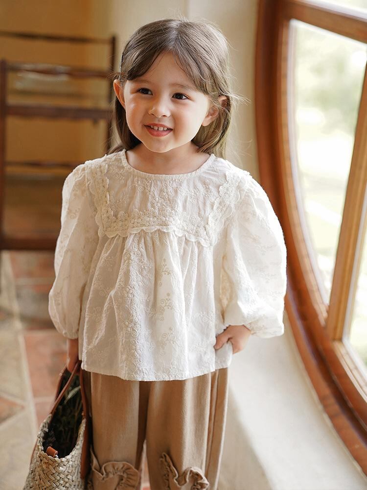 子供服 女の子 シャツ レース 花柄 ブラウス 春秋 かわいい 提花 コットン 長袖 ガールズ トップス 普段着 おしゃれ