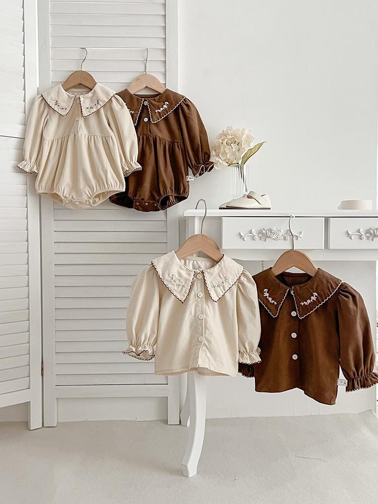 ベビー服 女の子 刺繍入りブラウス&ロンパース 上下セット 長袖 コットン100% 襟付き 花柄 春秋 66cm 73cm 80cm 90cm 100cm かわいい 普段使い お出かけ(x2)