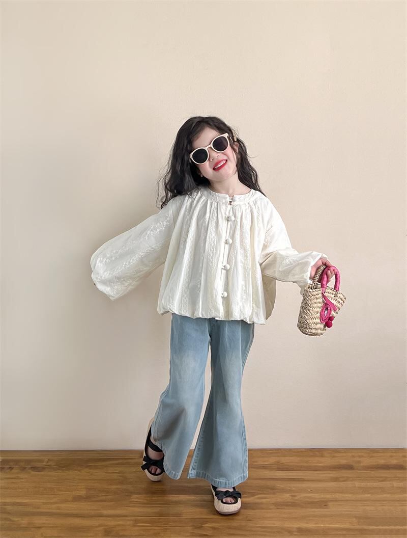 子供服 女の子 韓国風 ブラウス デニムパンツ セットアップ レース パフスリーブ ランタンスリーブ 春秋 長袖 トップス ズボン 2点セット かわいい おしゃれ ガールズ 女児 キッズ