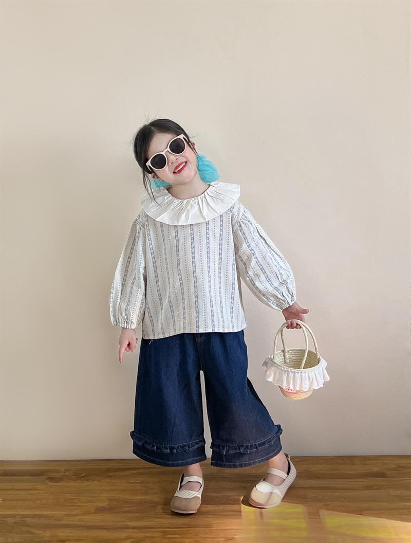 "・カラー: フリル襟ストライプシャツ、裾フリルジーンズ",