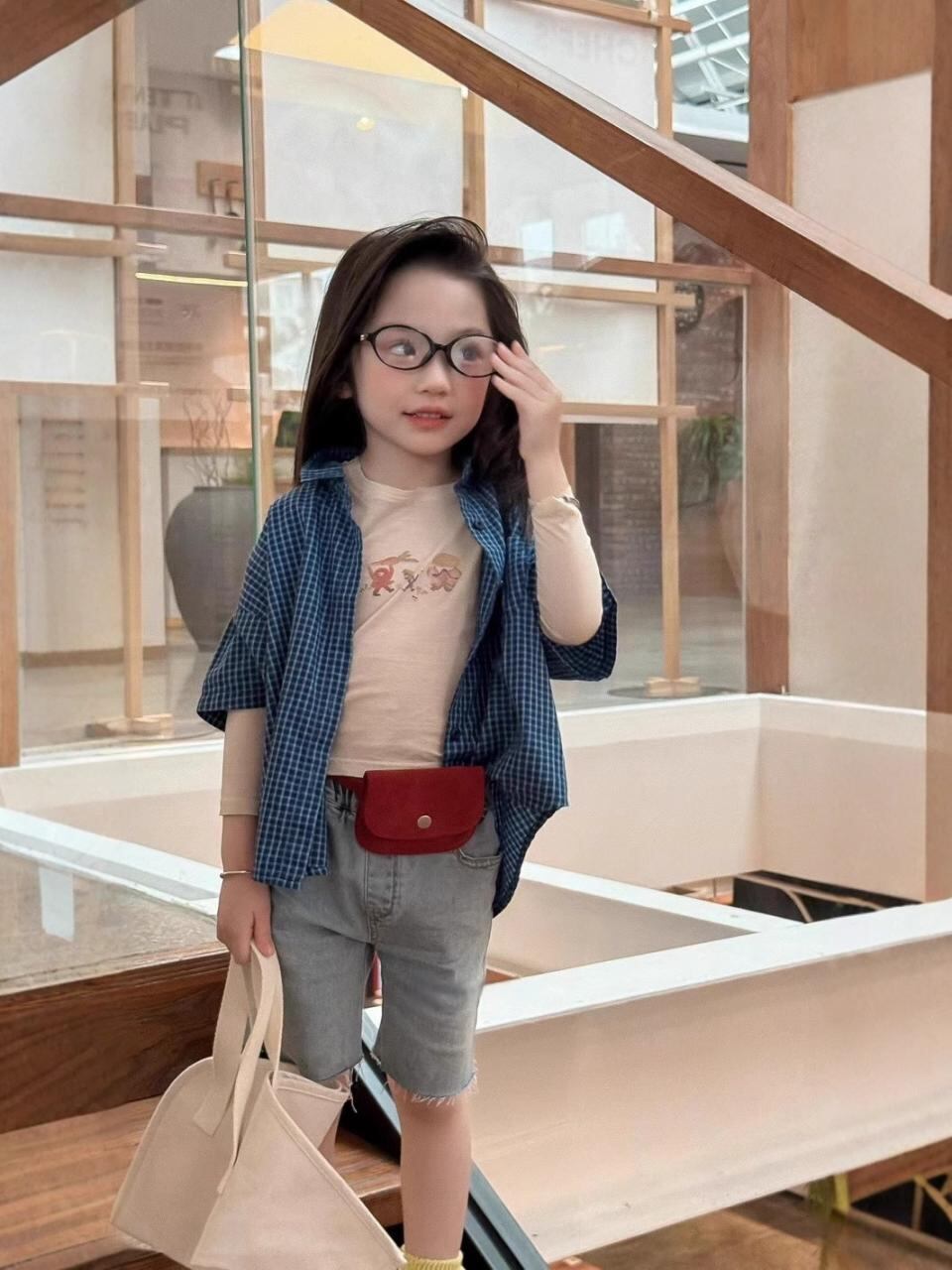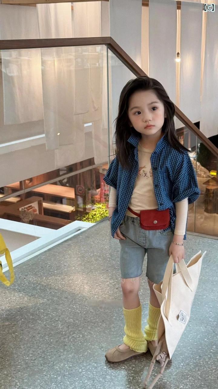 シャツ ガールズ 子供服 韓国風 ブルー チェック柄 レトロ 五分袖 接触冷感 100 110 120 130 140