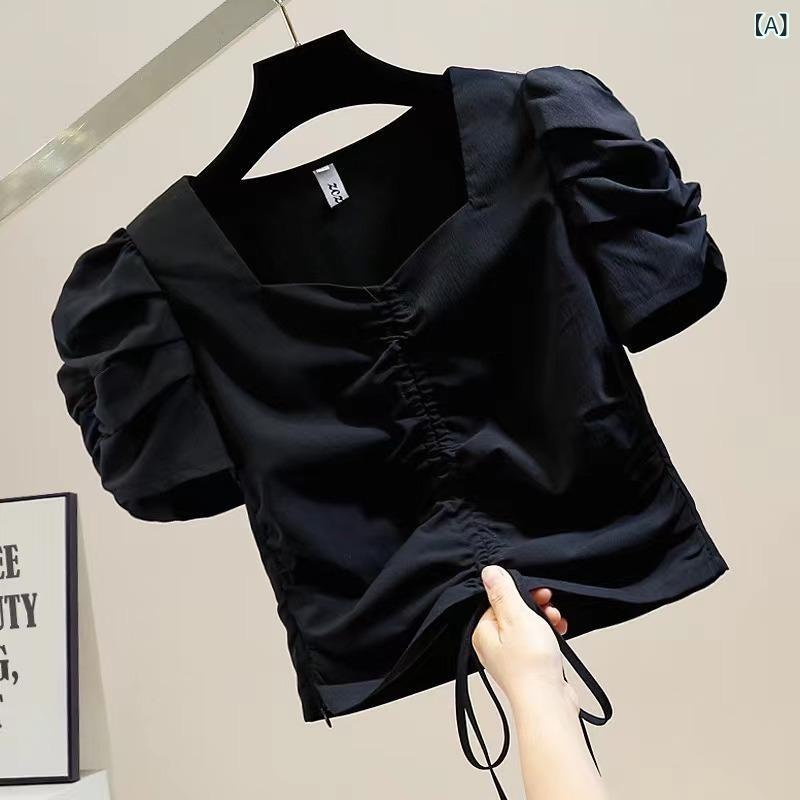 シャツ ガールズ パフスリーブ 半袖 ブラウス 韓国風 無地 トップス ギャザー スクエアネック ショート丈 スリムフィット かわいい おしゃれ ブラック ホワイト 綿