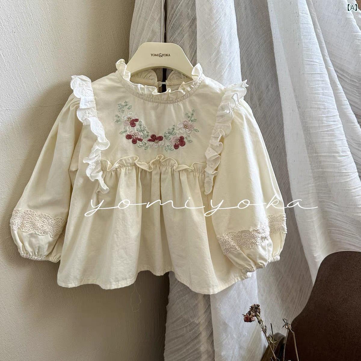 シャツ キッズ 長袖 花柄 刺繍 レース フリル襟 トップス 春秋 かわいい 綿100% ブラウス 米白