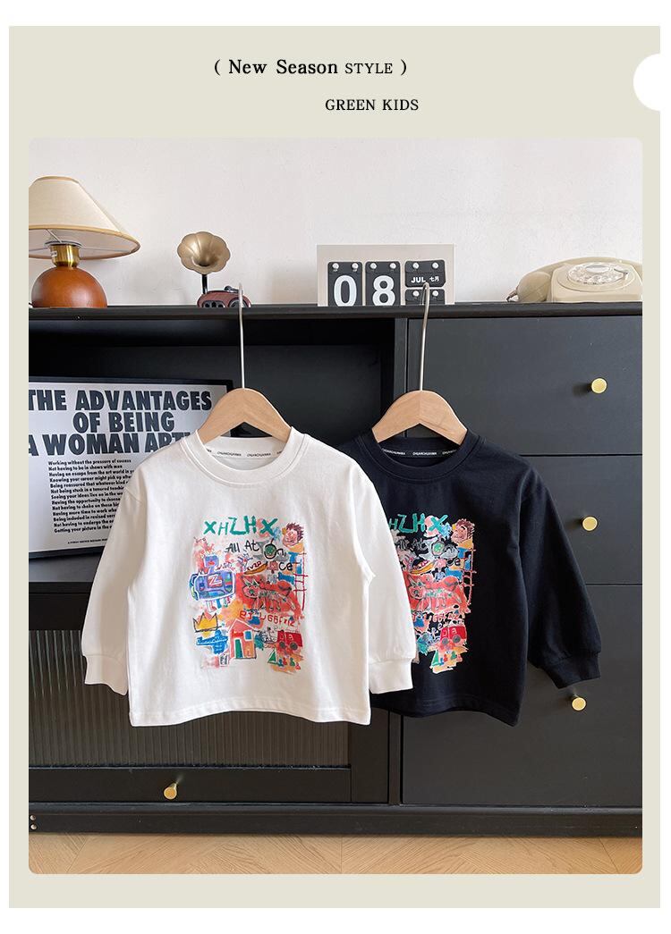 子供服 Tシャツ 男女兼用 春秋 長袖 カットソー 韓国風 落書き風 プリント 綿100% 保温性 ミルクホワイト ブラック