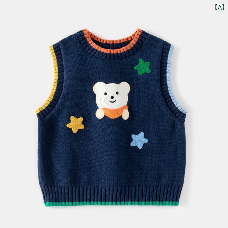 子供服 ニットベスト 男の子 ベビー服 ノースリーブプルオーバー トップス カートゥーン ベア 刺繍 綿100% 通園着 普段着 90cm 100cm 110cm 120cm 130cm