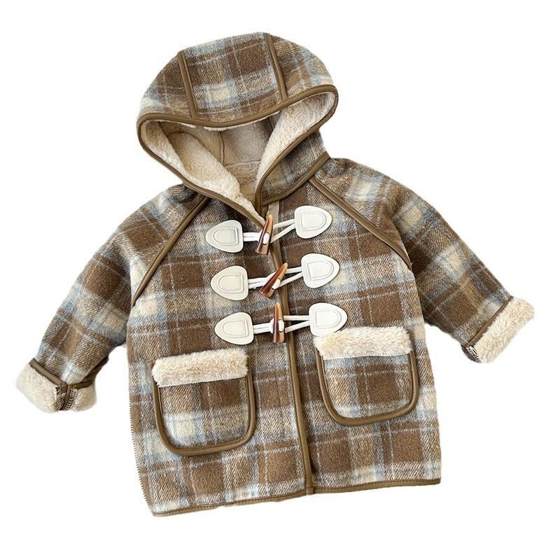子供服 毛呢コート 男女兼用 厚手 アウター 中長丈 チェック柄 冬 防寒 裏起毛 韓国風