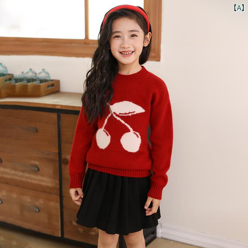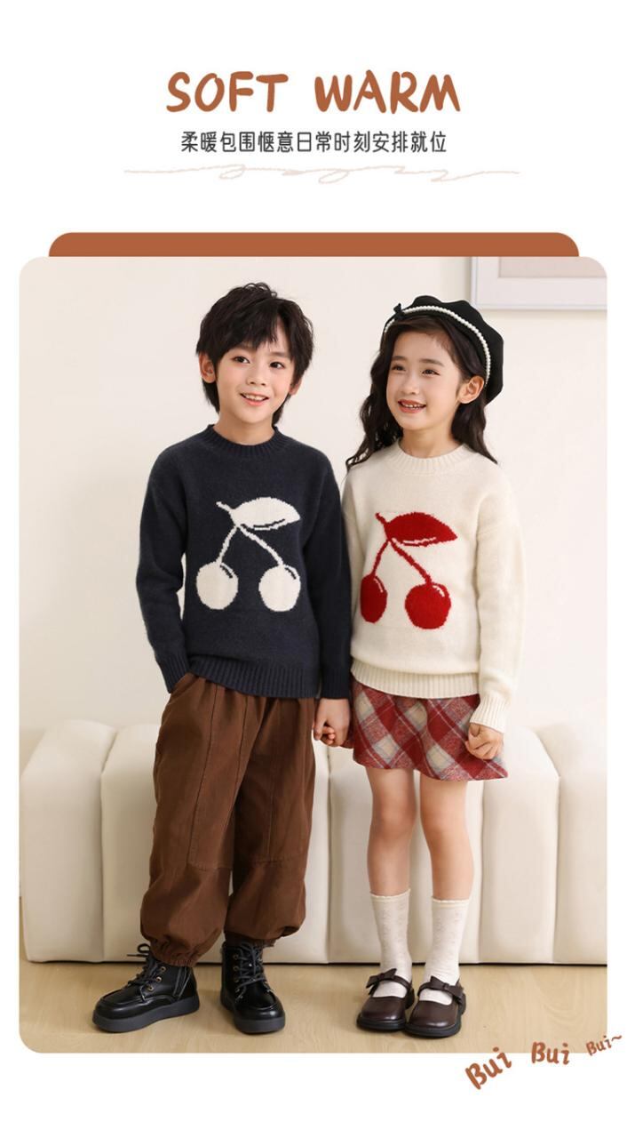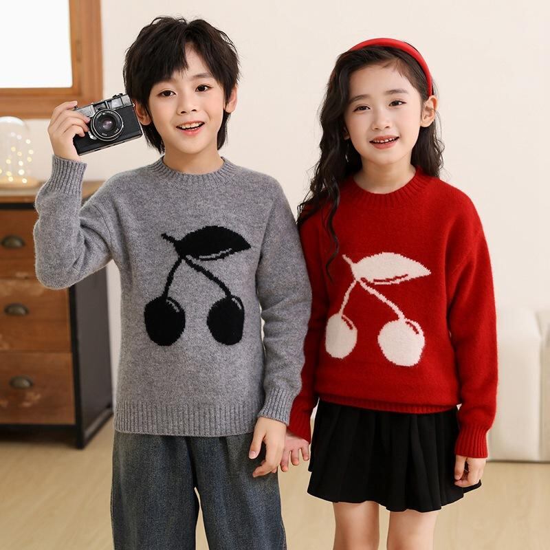 ニット 子供用 男女兼用 100% ピュアウール ハイネック セーター チェリー 刺繍 厚手 秋冬 韓国風 かわいい 赤 グレー アイボリー 100cm 110cm 120cm 130cm 140cm 150cm 160cm