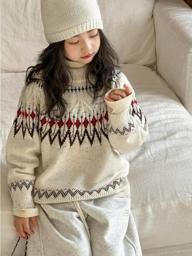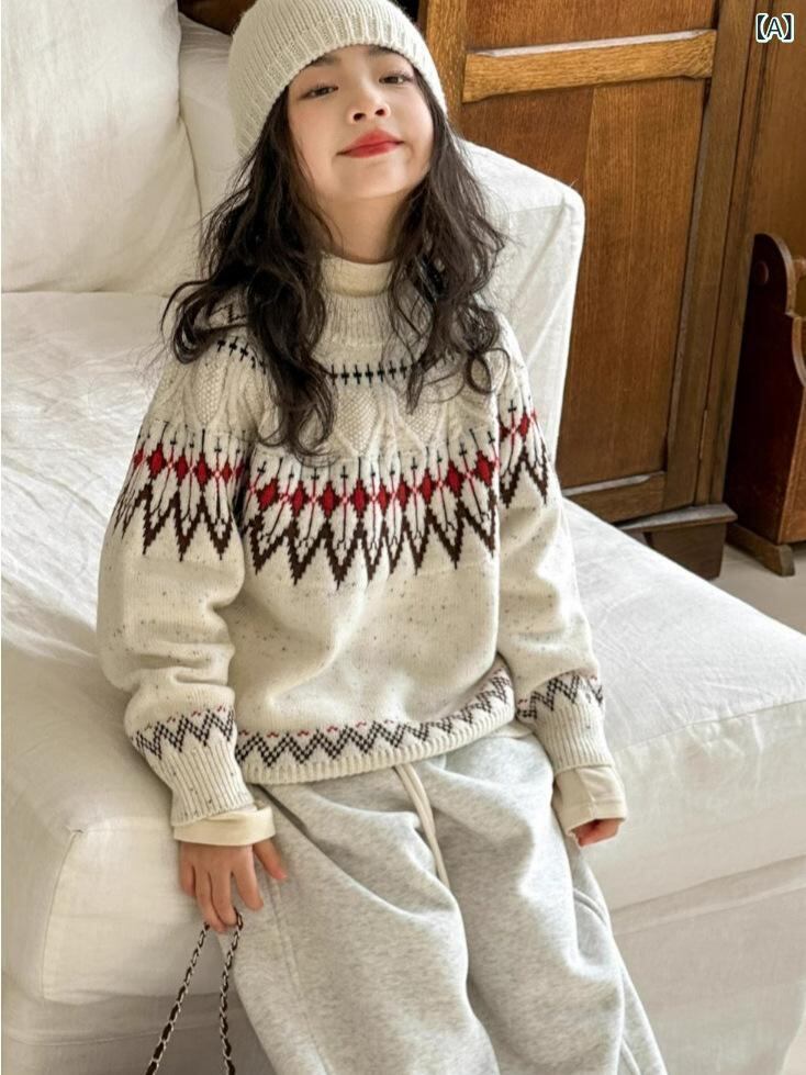 ニット・セーター ガールズ 子供服 フェアアイル柄 厚手 防寒 トップス 秋冬 長袖 丸首 かわいい 普段使い 通学着 オフホワイト
