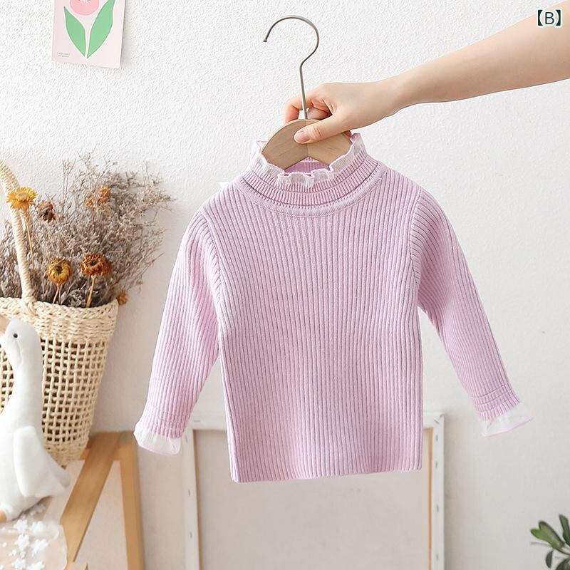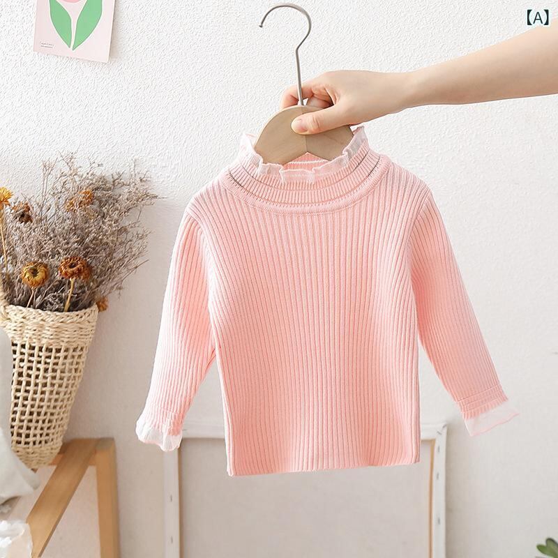 子供服 ニット/セーター 女の子 秋冬 薄手 ニット トップス 長袖 丸首 無地 かわいい レース フリル プリンセス カットソー ピンク系 80 90 100 110 120 130
