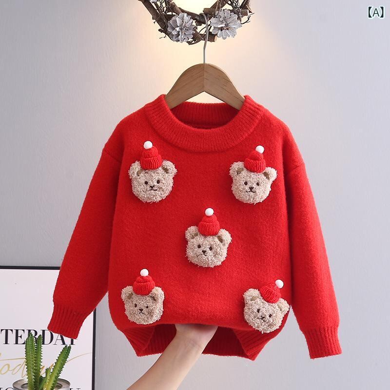 子供服 ニット セーター 女の子用 赤色 ニット トップス 裏起毛 厚手 秋冬 かわいい クマ柄 子供服 通園 通学