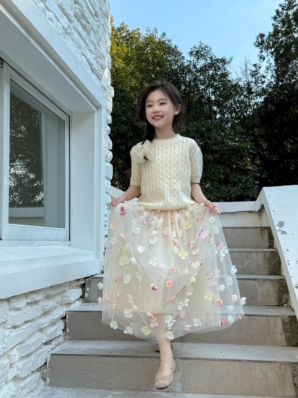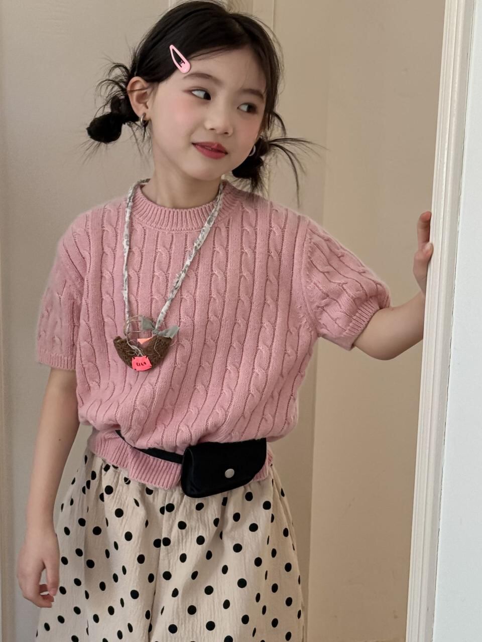 子供服 女の子 半袖ニット 春物 ニットトップス ガールズ 丸首 セーター メリヤス 普段着 ベージュ ピンク系 レッド ブルー