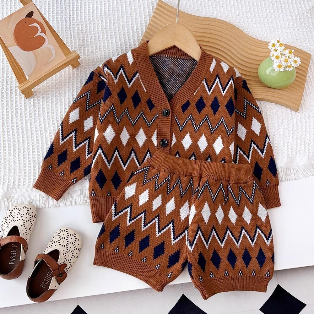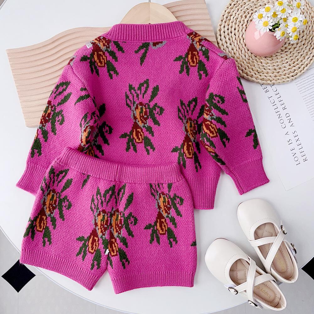 ニット セットアップ 子供服 女の子 ニット カーディガン ショートパンツ 2点セット ガールズ 秋冬 花柄 民族風 かわいい おしゃれ 普段使い