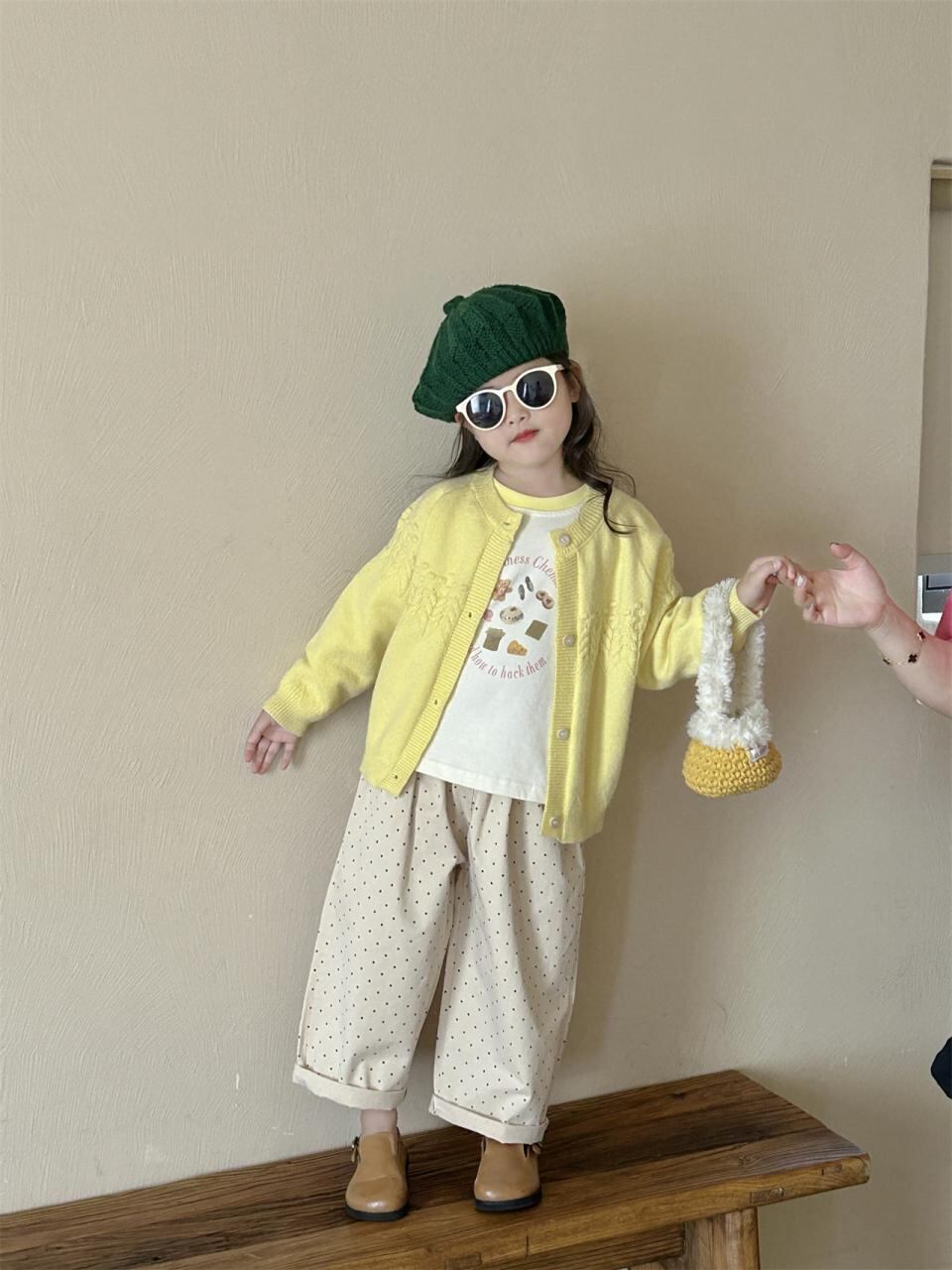 ・カラー: 黄色カーディガン, 米色+黄色のラグランスリーブTシャツ, ベージュのドット柄コットンパンツ
