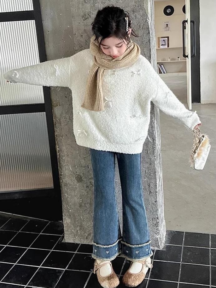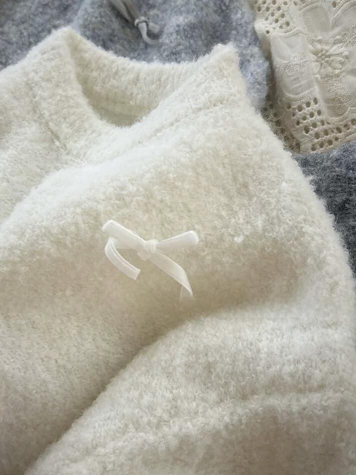 ニット キッズ 女の子 子供服 セーター 秋冬 ラウンドネック 蝶結び かわいい 暖かい ゆったり 厚手 長袖 トップス 通学 普段使い ブルー ホワイト系