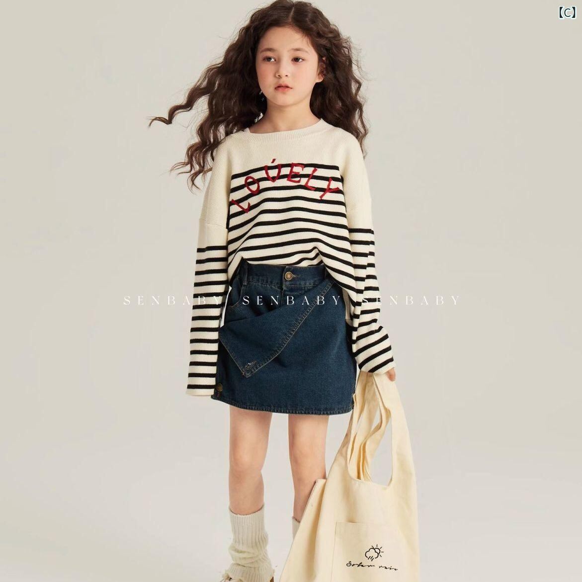 ニット 女の子 キッズ ニットトップス 春秋 ストライプ セーター 子供服 長袖 丸首 かわいい おしゃれ 普段着 通園 通学