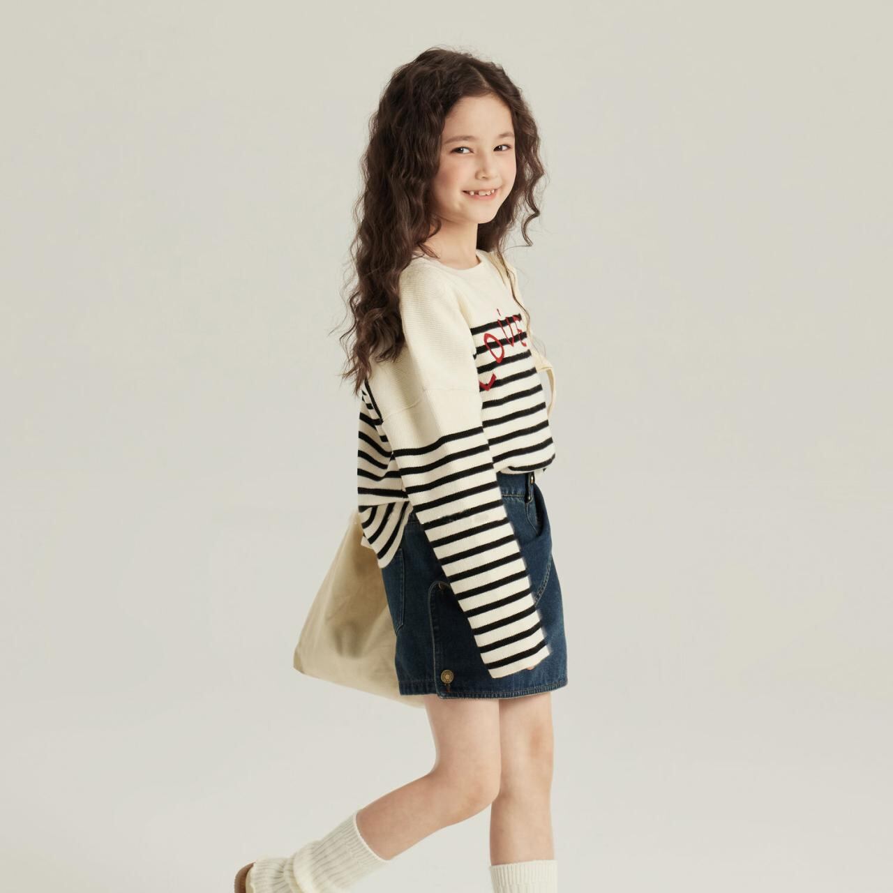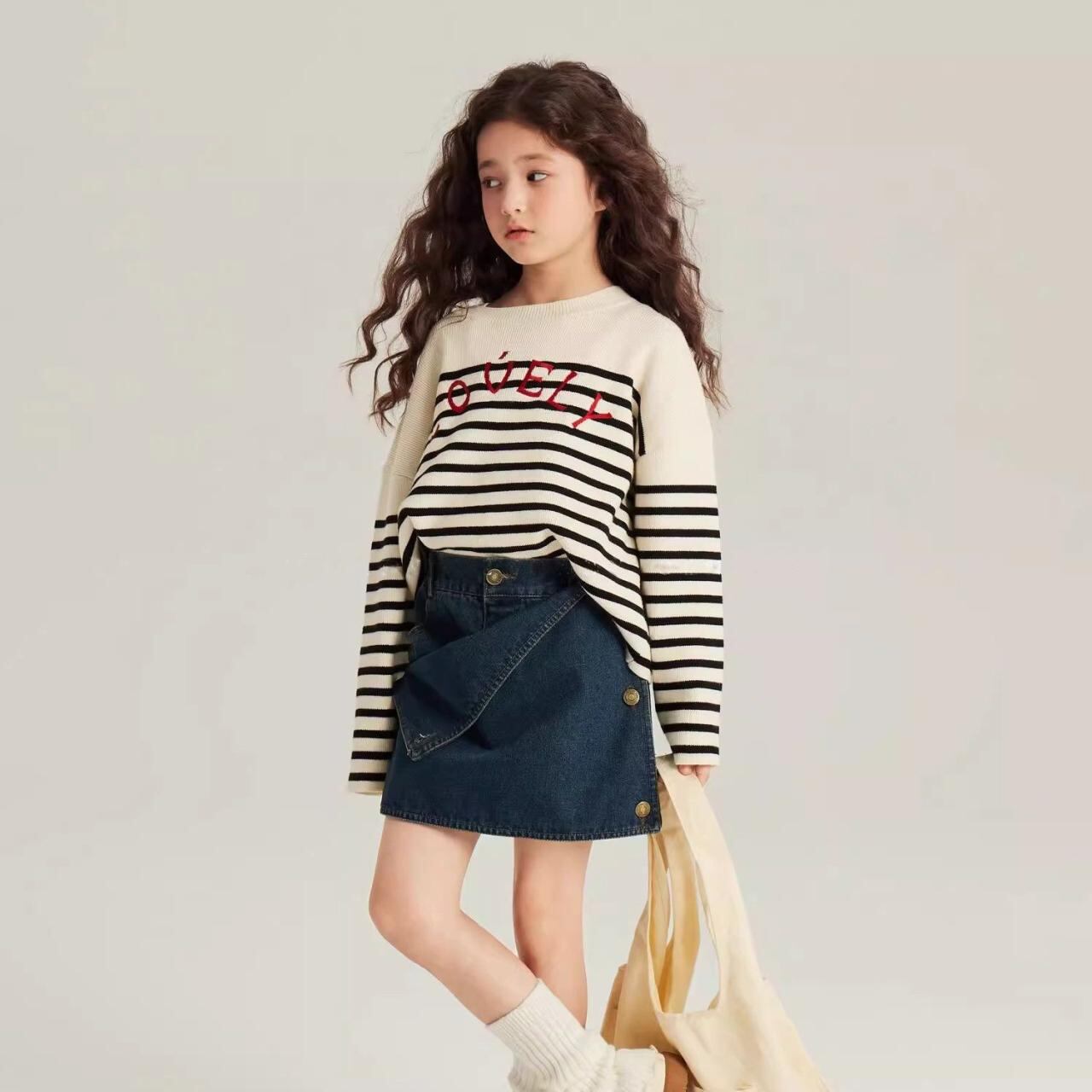 ・カラー: オフホワイト 刺繡ストライプセーター, ブルー デニムスカート(取り外し可能), アイボリー セーター+デニムスカートセット