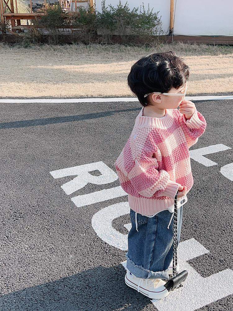 ニット 子供服 男の子 ストライプ ピンク系 春秋 長袖 丸首 プルオーバー セーター 普段着 おしゃれ かわいい 80 90 100 110 120 130 140