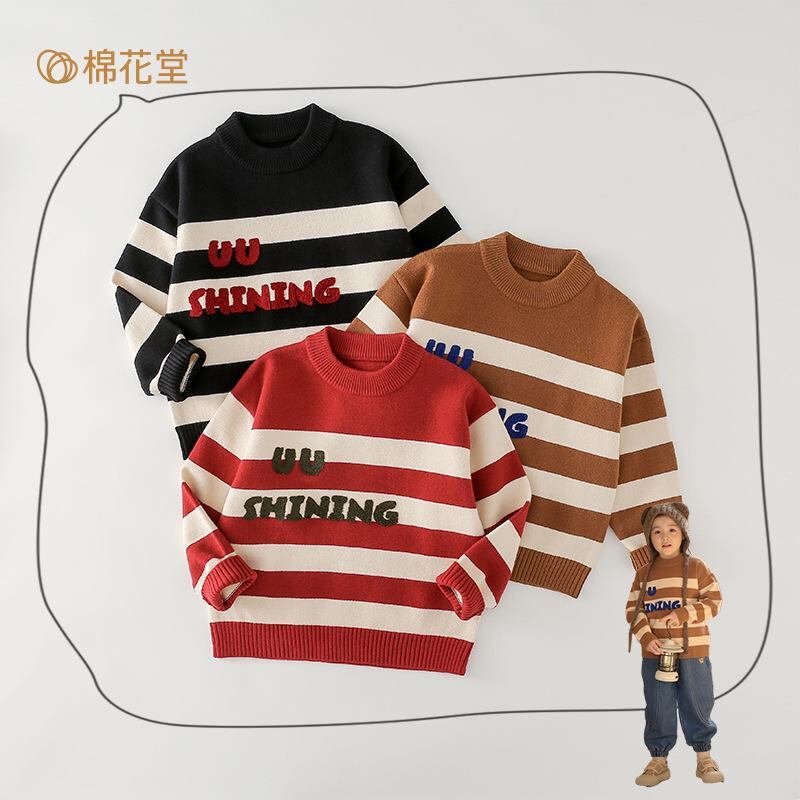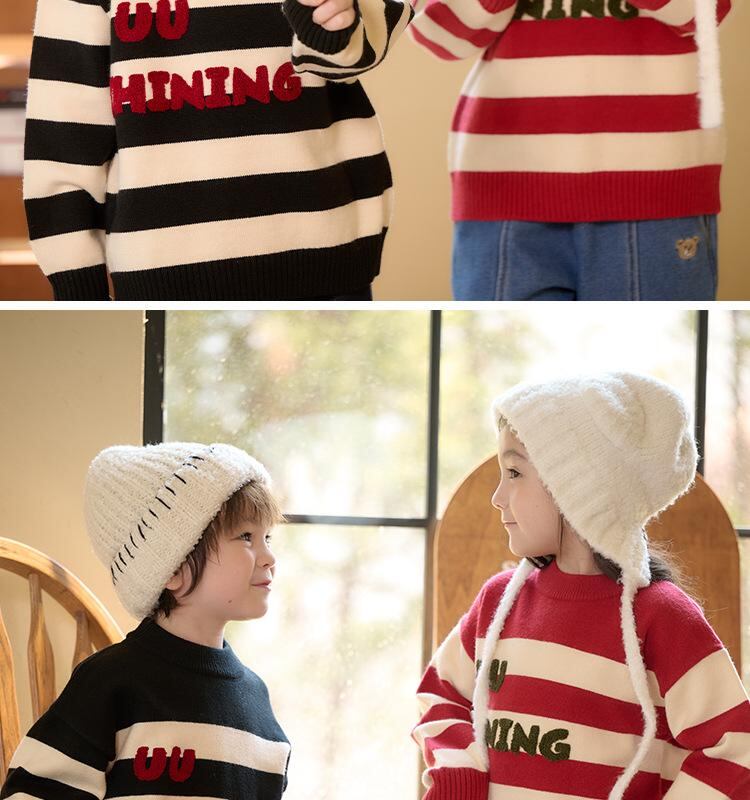 子供服 ニット セーター キッズ 男女兼用 ストライプ 厚手 秋冬 丸首 長袖 普段着 かわいい 柔らかい 通園 通学 レンガ色 ブラウン ブラック