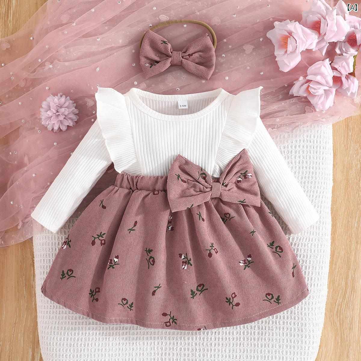 ワンピース ベビー服 女の子 小花柄 長袖 Aライン チュニック & ヘアバンド 2点セット 綿 春秋 70 80 90 かわいい 普段使い 赤ちゃん 乳幼児 お出かけ着