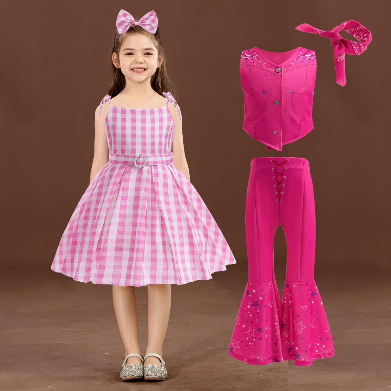 ワンピース 子供 女の子 プリンセスドレス コスプレ 吊りスカート 膝丈 ピンク チェック柄 かわいい ハロウィン パーティー イベント なりきり バービー風