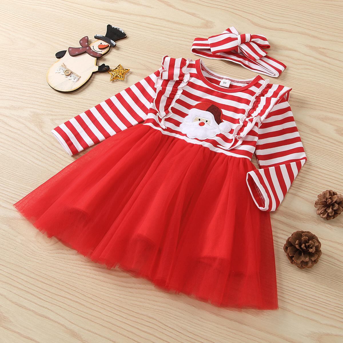 ワンピース 女の子 クリスマス ストライプ サンタクロース プリント コットン チュール スカート ヘッドバンド付き 秋冬 かわいい ガーリー イベント パーティー