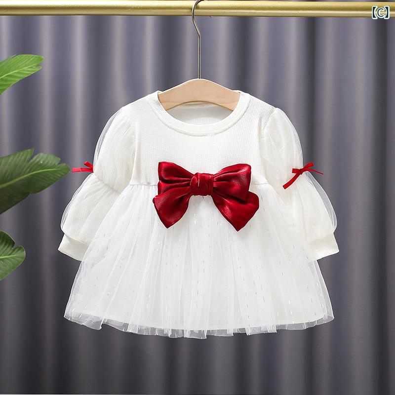 ワンピース 女児 チュールスカート 子供服 長袖 ベビー チュール バタフライ 蝶結び Aライン かわいい 80 90 100 110 cm ピンク系 レッド ホワイト