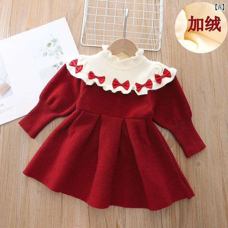 ワンピース 女の子 ニットワンピース 子供服 チュール Aライン 蝶結び かわいい 長袖 秋冬 裏起毛 普段使い 発表会 結婚式 パーティー お呼ばれ ポリエステル レッド ブルー 90 100 110 120 130