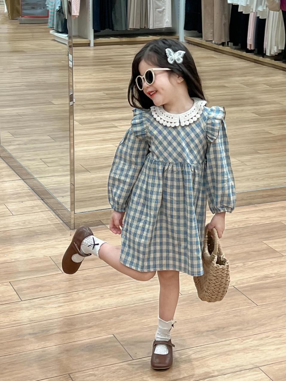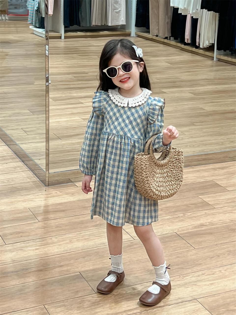 ワンピース キッズ かわいい 藍色チェック フリル 花柄襟 長袖 プリンセス チュニック 90 100 110 120 130 140cm 綿素材 春秋 女の子 子供服