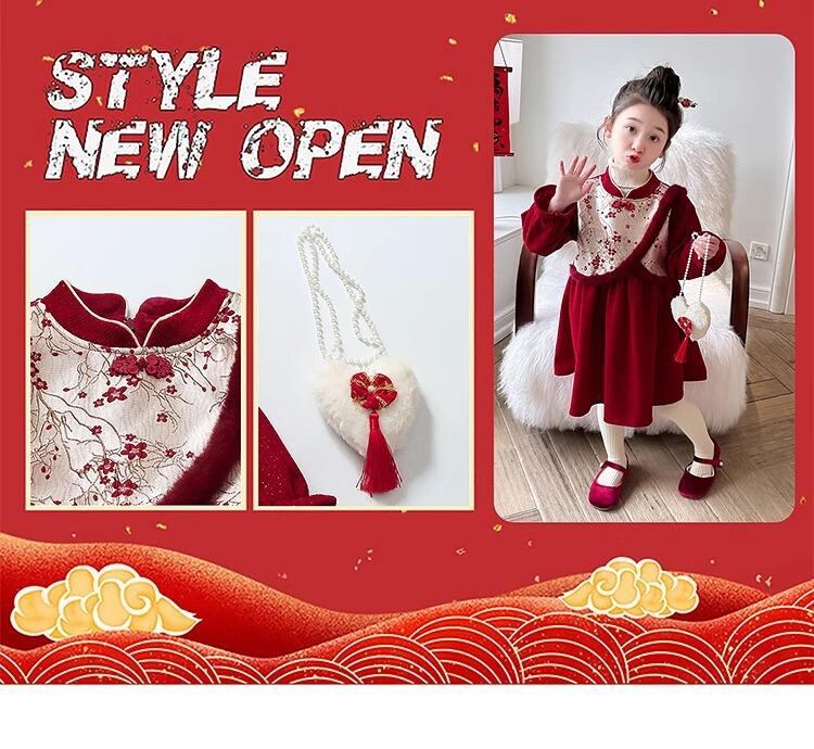 ワンピース キッズ 女の子 チャイナドレス 秋冬 子供 新年 普段使い かわいい チュール Aライン 長袖 発表会 お祝い 赤