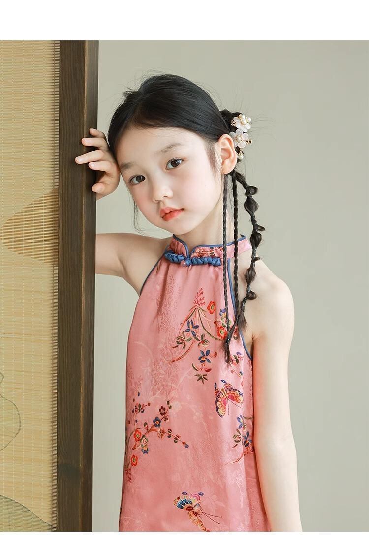 ワンピース キッズ 女の子 子供 チャイナドレス セットアップ 綿 花柄 牡丹 ピンク系 ブルー レトロ かわいい おしゃれ ガールズ 夏