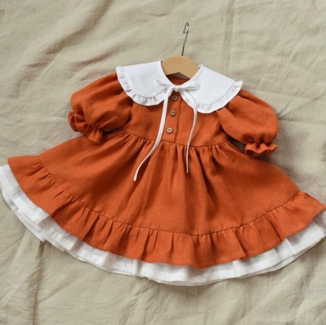 ワンピース 女の子 ロリータ 春夏 子供服 幼児 荷葉フリル襟 プリンセス パフスリーブ Aライン 亜麻 リネン 90cm 100cm 110cm 120cm 130cm 140cm かわいい 柔らかい 普段着