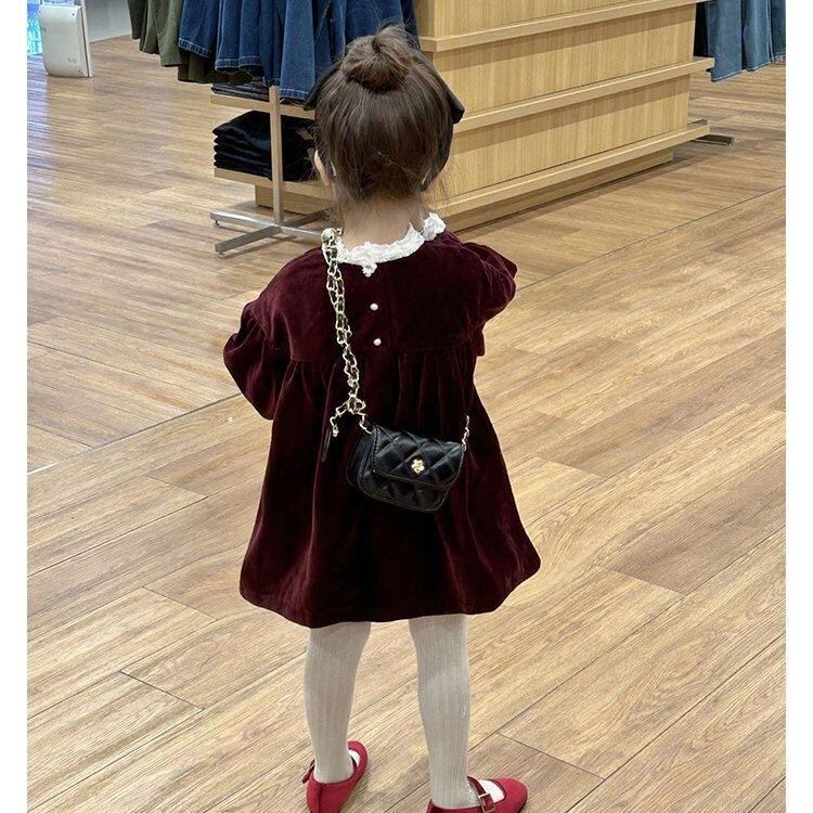 子供服 ワンピース 女の子 ベルベット Aライン 酒 красный 光沢なし ワインレッド プリンセスドレス かわいい フリル 長袖 チュニック 普段着 パーティー イベント 秋冬