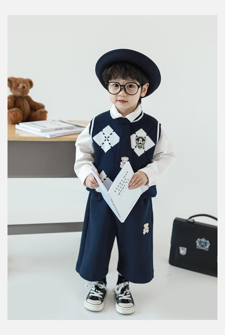 キッズ 男の子 フォーマル スーツ 5点セット 長袖シャツ ベスト ジャケット パンツ ゆったり 格子柄 チェック柄 綿100 秋